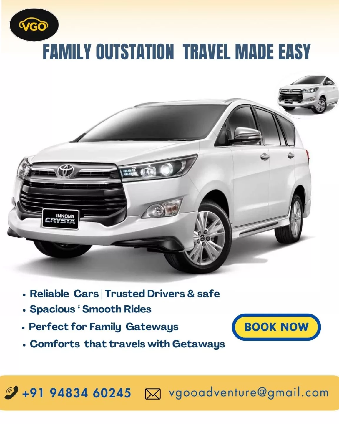 VGO Adventure brings you reliable family outstation travel with premium car rental services. Whether it’s a weekend getaway, a family function, or a long-distance holiday, we provide well-maintained vehicles, experienced drivers, and personalized service to make every journey safe and enjoyable.